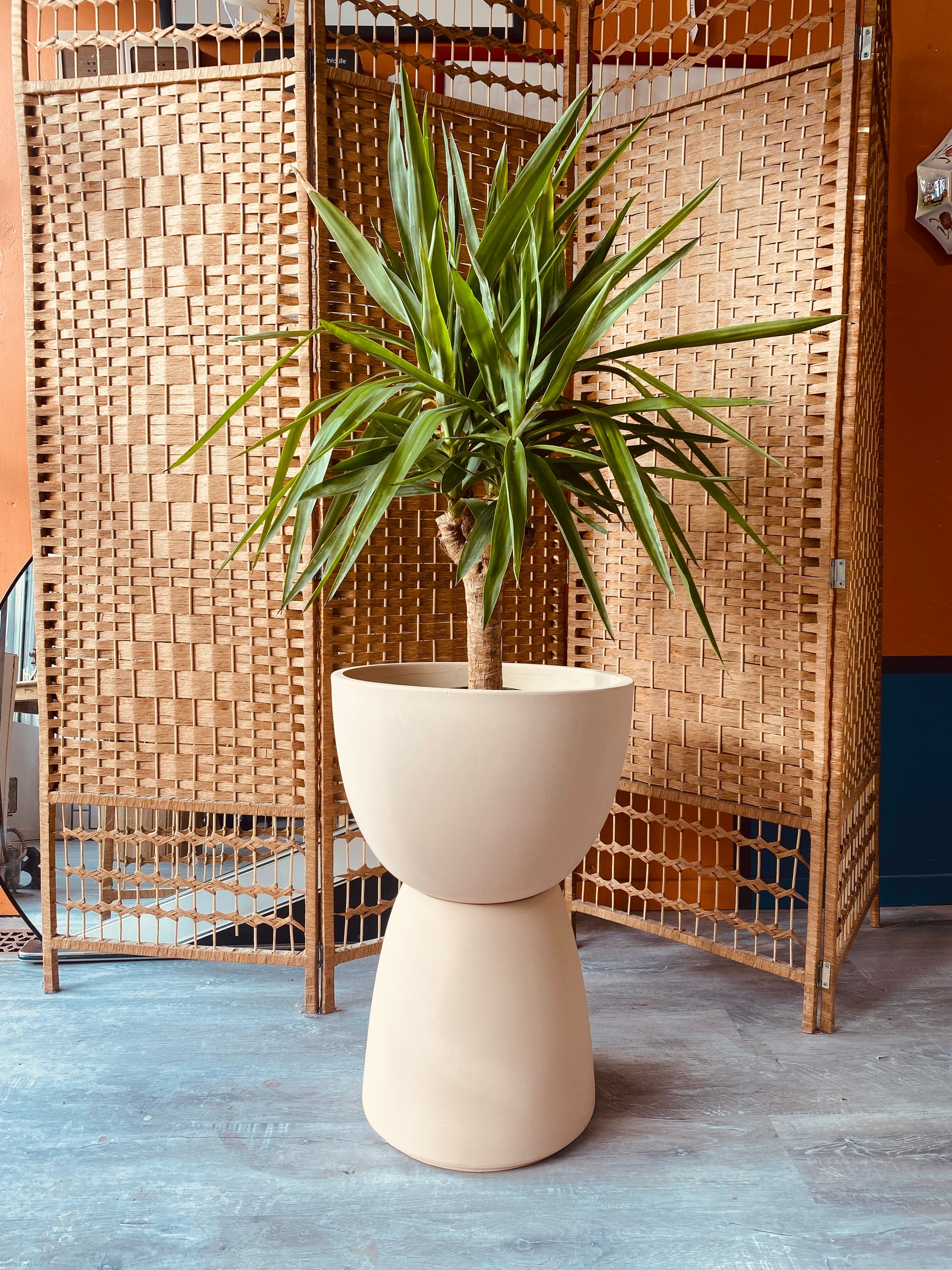 This ceramic planter is a heavenly pale golden colour that will warm up any room immediately. It comes in 2 pieces: a ceramic bowl with a hole for drainage that sits atop a lower ceramic watertight drum. Its outer finish is matte and the interior is glazed.