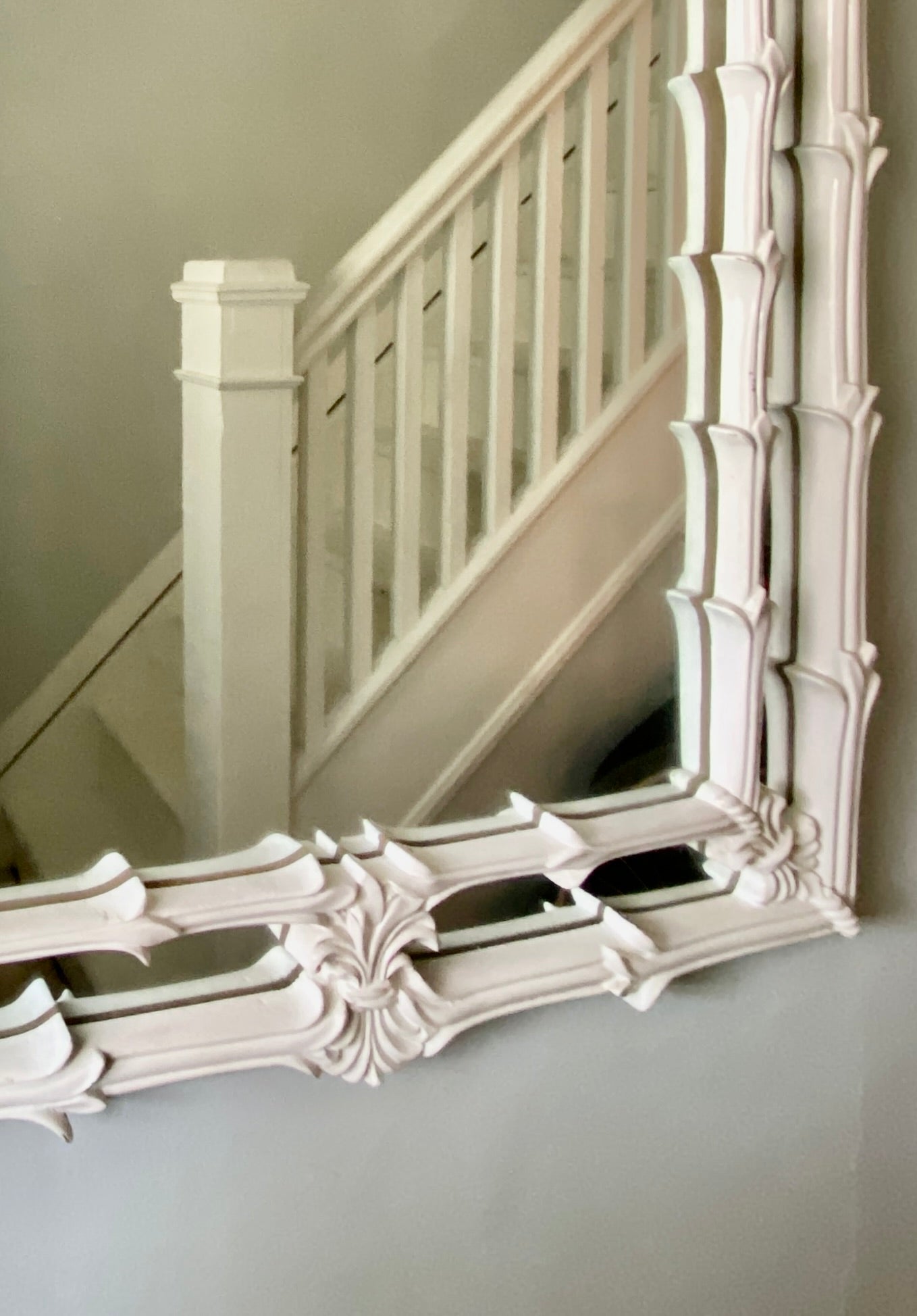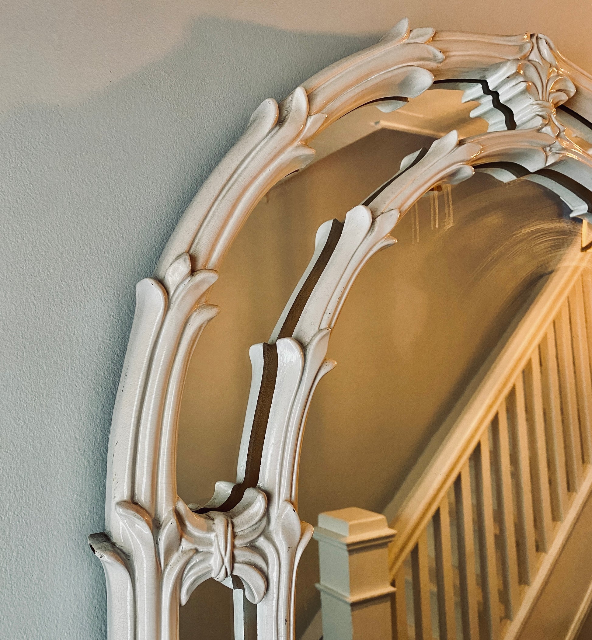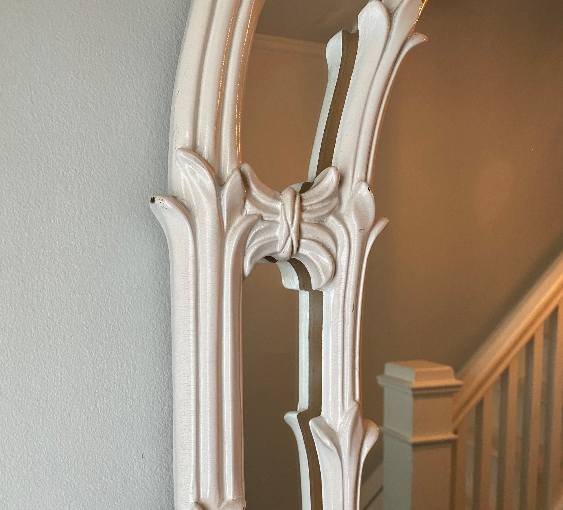 Absolutely Stunning Mirror Large Hollywood Regency Style Palm Leaf Mirror. No chips or breaks in mirror glass. This piece is heavy- over 50 pounds. Mirror does have hanging attachment on back. Perfect in a hallway or as an accent mirror. 49.5H x 34W x 1.75D