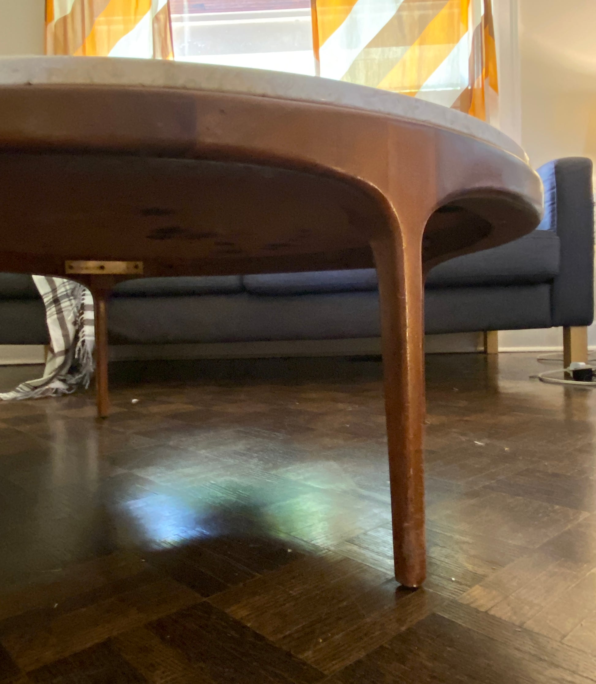 It's the MCM curved arched table legs that make this coffee table a real beauty! Add the round marble top and it just can't be beat. I have not come across another one like it.
